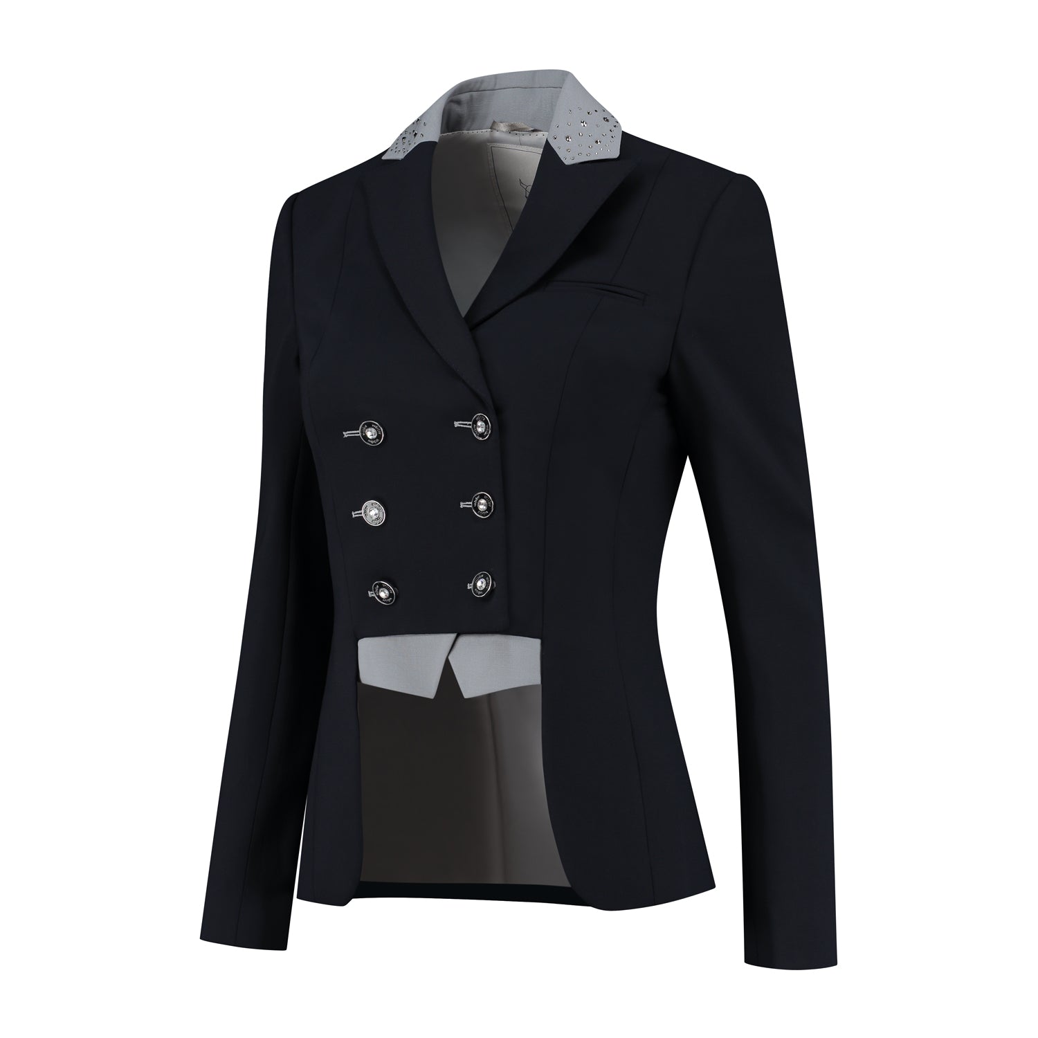 In deze fantastische korte slipjas steel je de show. Deze donkere navy jas heeft grijze accenten. De schitterende black diamond Swarovski op de kraag en rugband maakt dit paardrijjasje tot echte eyecatcher.